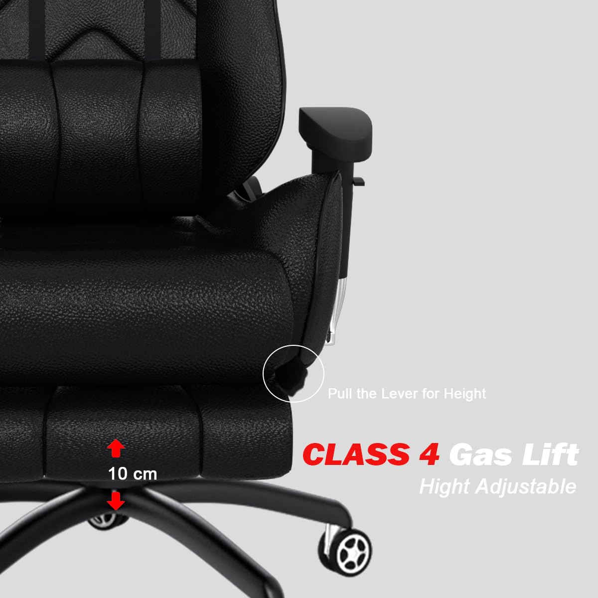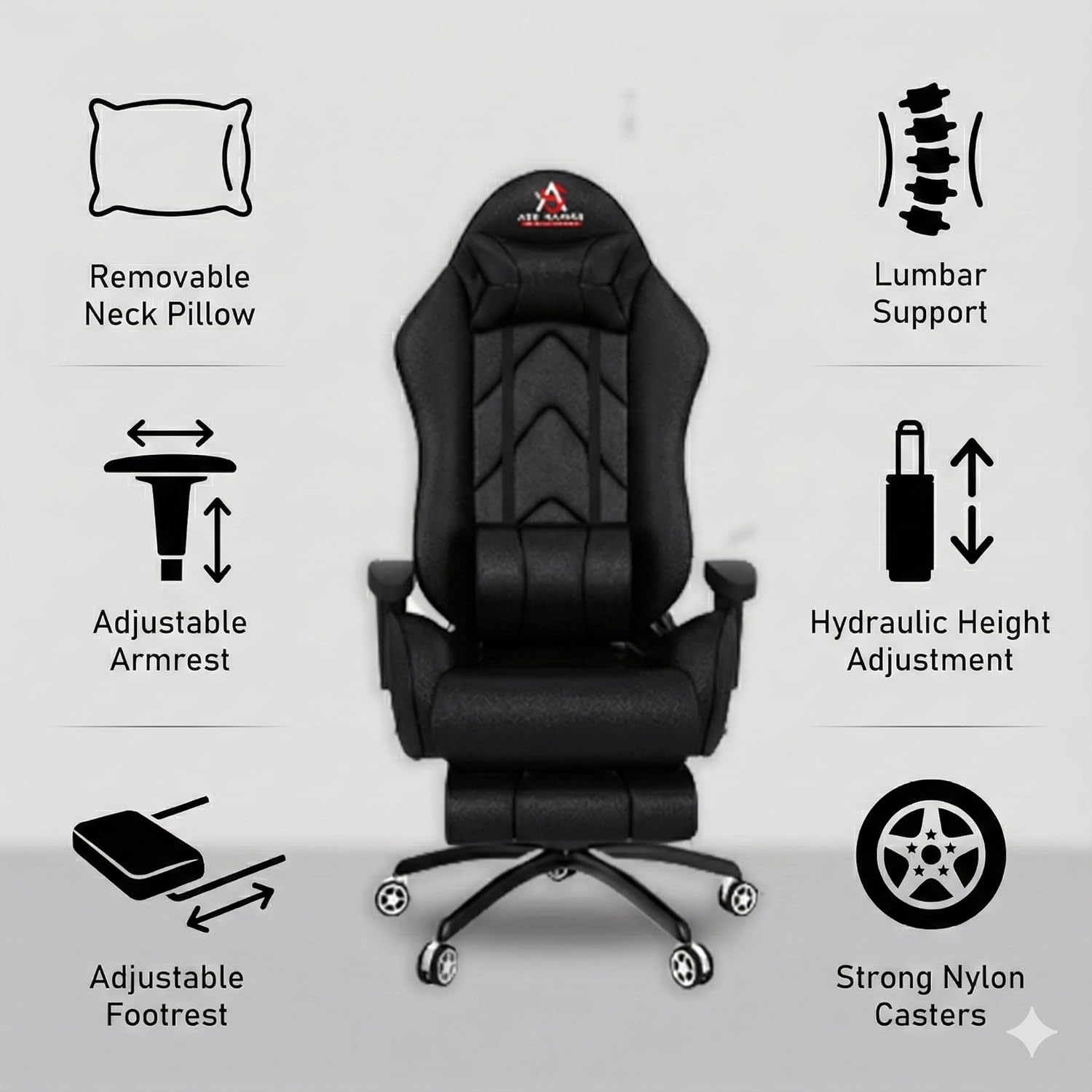ASE GAMING Gold Series Ergonomic Gaming Chair with Footrest Premium PU Leather, Adjustable Neck & Lumbar Pillow, 180 Degree Recline with Black Metal Base (Black Color)