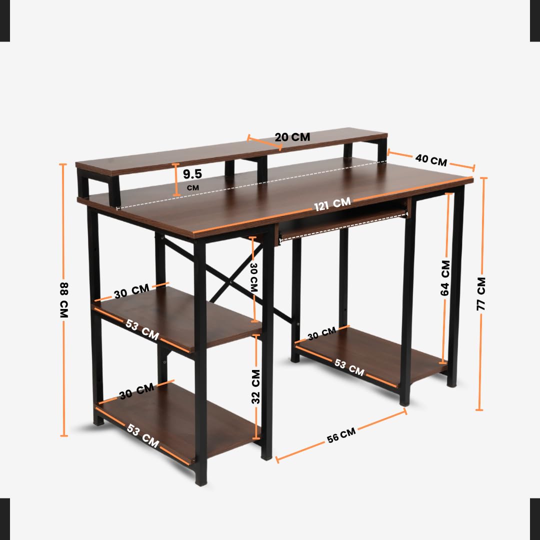 PRODUCT DIMENSIONS: Length = 120 cm, Width = 60 cm, Height = 87 cm (47.2 inches x 23.6 inches x 34.2 inches) Monitor riser size : L = 120 cm x W = 20 cm x H = 10 cm and Keyboard tray size : L = 55 cm x W = 32 and Shelves size : L = 30 cm x W = 60.