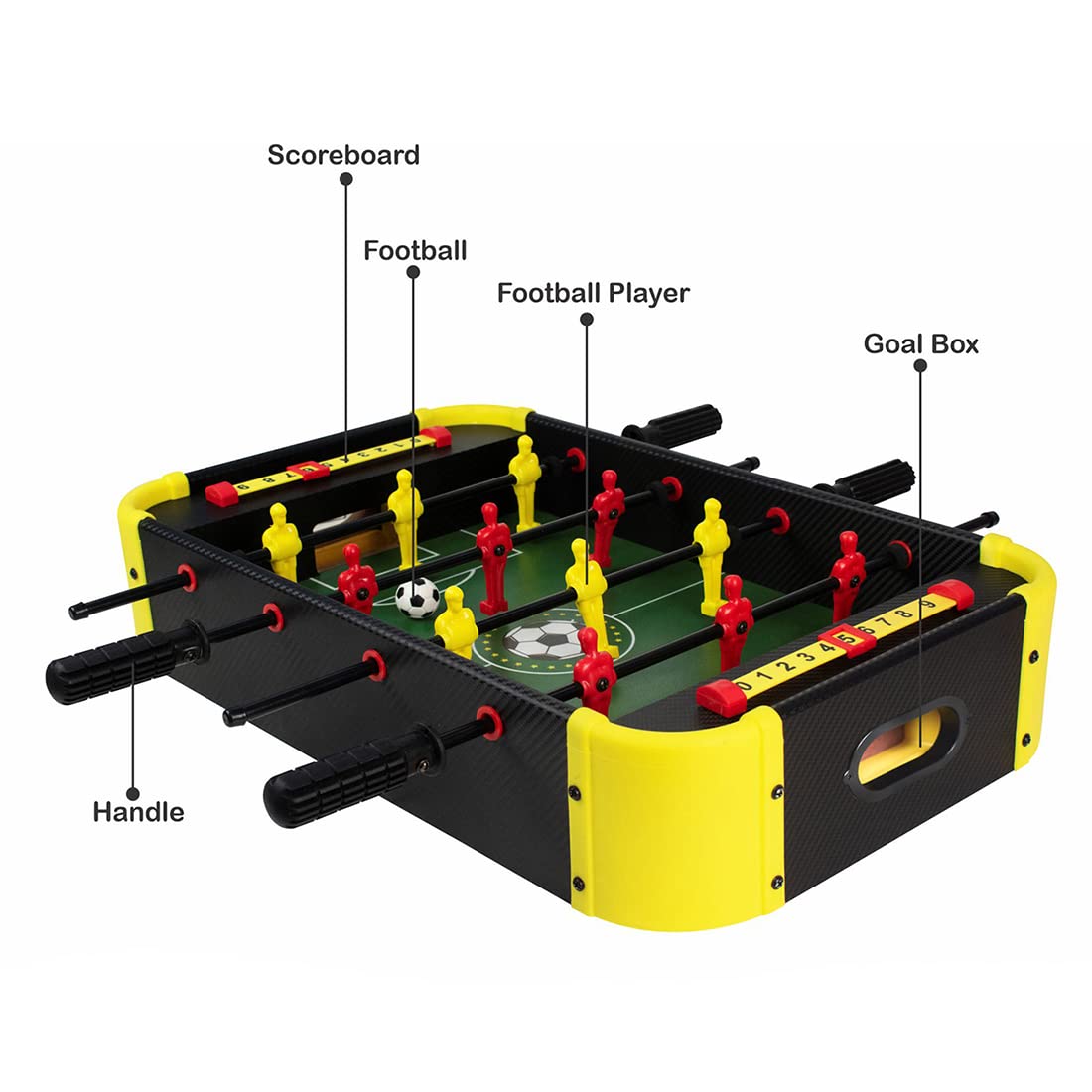 Our Portable Foosball or Soccer Game Table is medium size,durable,portable and easy to store.Recommended age range:3 Years and Up.The soccer game table features 360° rotated built-in soccer figures, four rows of two players each row, two rows for each team, allows each child to shoot at goal from any position from any angle.Fun for indoor play, the foosball or soccer game table can also be used outdoors with a flat surface for a full head-to-head competition. Easy to assemble in minutes!BRING FOOTBALL HOME : The medium size indoor game foosball or indoor game are designed for kids to play with their friends and enjoy the game at their home. It is cool addition for kids playhouse as they can team up with parents or their friends at birthday party or any other occassion and enjoy their game.SMOOTH-SPINNING RODS FOR FAST SHOOTING ACTION: The durable and strong foosball board is good for kids or adults to play with it. It has 4 rows with 4 strong handles to shoot the players. It is built for ultimate performance, with sleek chrome rods for smooth-spinning fast shooting action. Improve your speed and accuracy with these easy to grip handles, while you and your opponent battle it out on your half of the court.INTEGRATED GOAL COUNTERS & NON-SLIP FEET:This amazing foosball table is sure to be the talk of your home. Whether you’re a football fanatic or just like a good game, the slide goal counters and non-slip feet make this table easy to control, ensuring everyone has fun whether they’re playing on it or watchingDimension: 51 cm x 31 x 10 cm Weight 2kg 48grams.Comes with 4 handles, 360 degree inbult soccer game, 2 Soccer Ball & 2 players Game. LightWeight & Portable. Assembly Required. All parts are provided for assembly